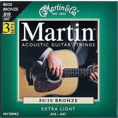Great saving on buying 3 sets! Martin Acoustic Guitar Strings have an 80/20 composition for brilliance, clarity, and longevity of sound. The Bronze winding alloy is ideally suited for making strings have deep, rich basses and clear, bright trebles. The Martin acoustic pack has high-quality strings for daily use. Core and wrap wires meet strict requirements to make the grade. Martin guitar strings are wound to precise specifications. Choose your preferred gauge Martin 80/20 Acoustic Guitar Strings Features: Bronze alloy for brilliance and long life Great price Studio-quality performance